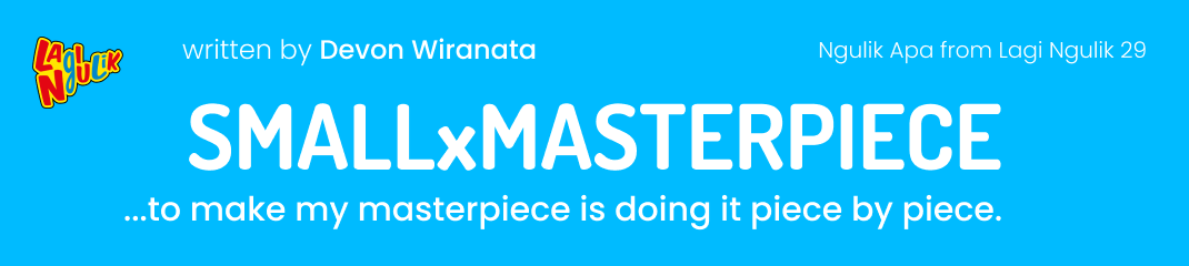 Mungkin aja, the great work gw dibuat bukan dari sesuatu yang besar, sesuatu yang hustling banget, yang kerja keras banget, tapi mulai dari sesuatu yang kecil. Bisa aja my masterpiece is built by small pieces, piece by piece.
